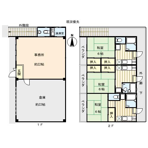 1階が事務所・倉庫で2階がワンルームタイプ3部屋の事業用建物です。